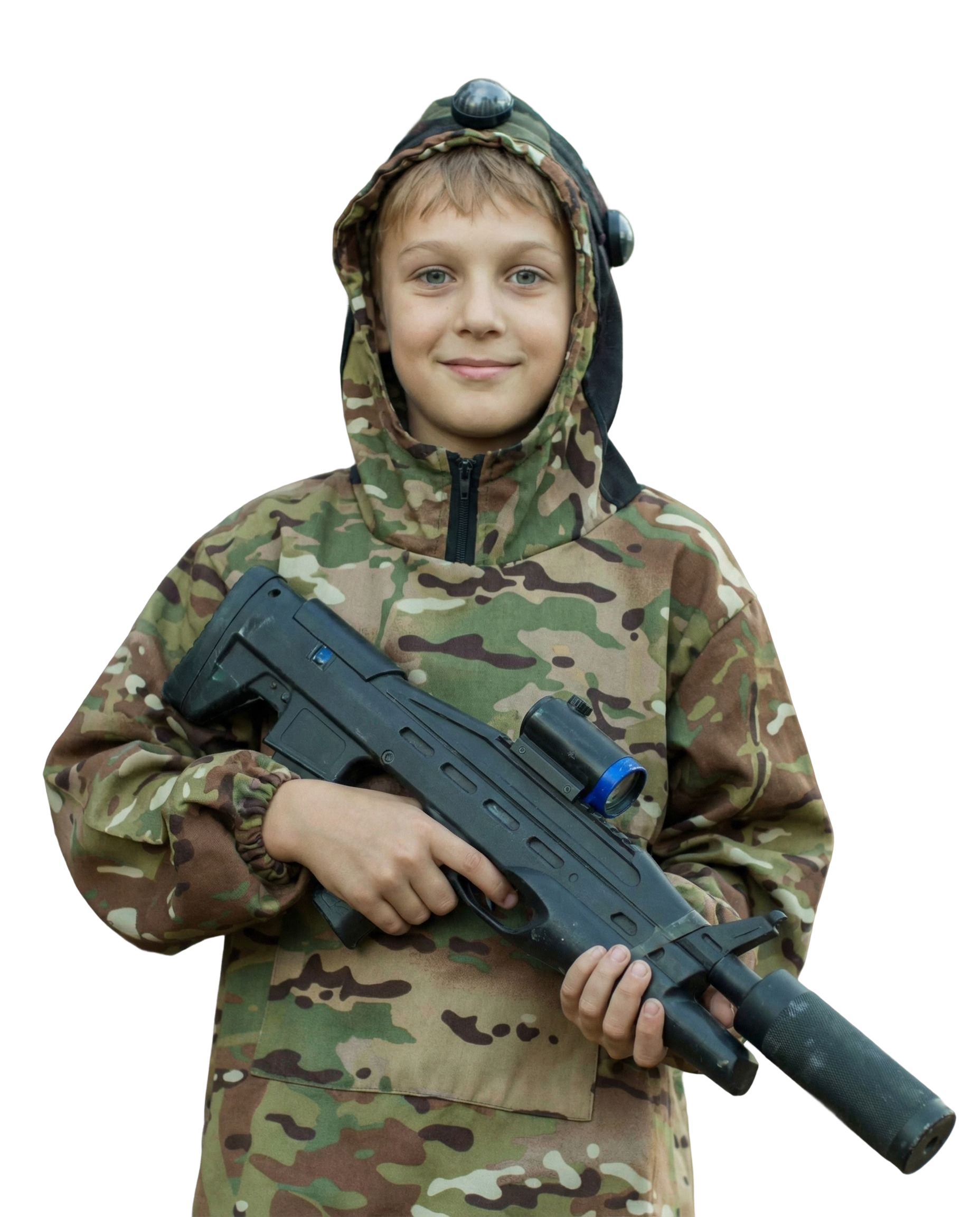 Детский пейнтбол — это контактная командная игра для детей с 7 лет, в которой вместо тяжелых ружей используются легкие пластиковые маркера. За счет специального пружинного механизма и сила выстрела в несколько раз слабее, чем в пейнтболе, а диаметр шариков с краской меньше, что исключает синяки и ссадины на теле.